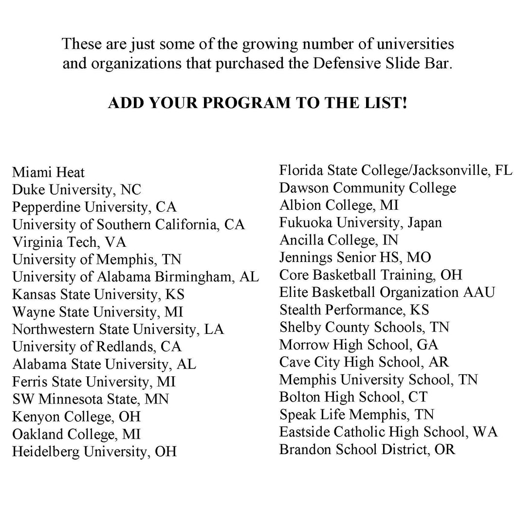 Will Stephens (Associate Director of Sports Performance Men's & Women's Basketball Duke University)As the sports and performance coach at Duke University I use the defensive Slide Bar with both the men's and women's basketball teams for strength training. I use it in our off-season agility/basketball footwork training. I also use it in some of our lifting sessions and it has been beneficial for use during rehab with some of our players. I absolutely love the Defensive Slide Bar and will be ordering more. It is a device every coach should have to teach proper footwork/movement training.